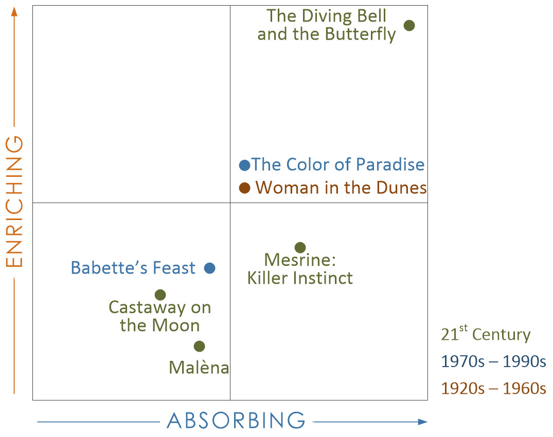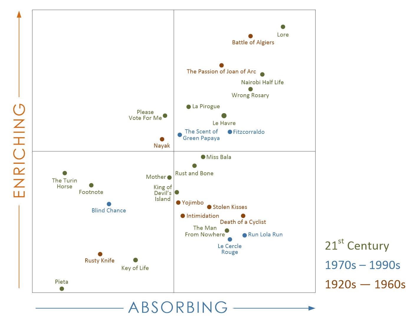 Here’s my take on a “magic quadrant” graph that positions each movie relative to how gripping and enriching I found it. I’ll continue to tweak this as I proceed through the project, but I’m finding it to be a very intuitive and helpful way of thinking about films.